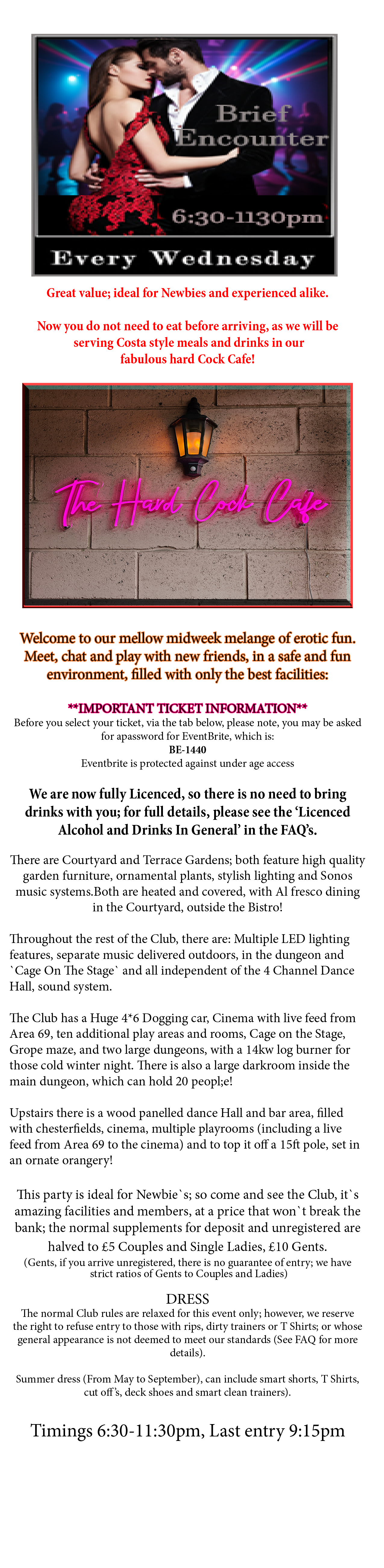 The Dungeon is closed between 01 Nov and 15 Mar at Brief Encounter; groups can contact the Club for special opening arrangements