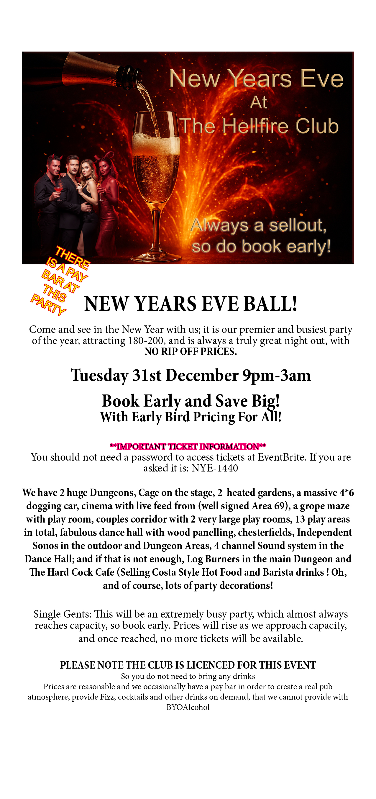 NYE this year is Tuesday 31st Dec, Discounted tickets until 20th Dec, or earlier, if we approach capacity!