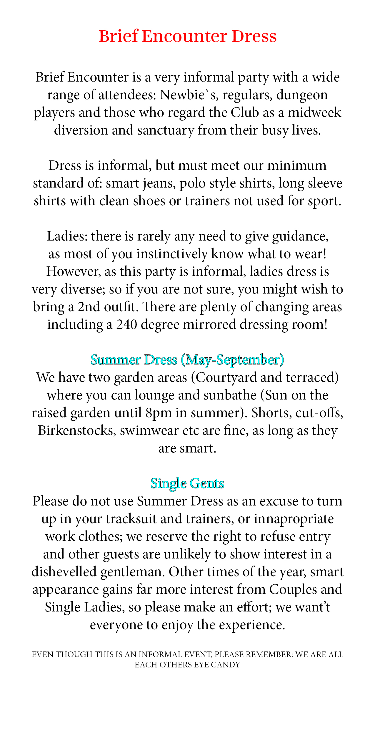 The Dungeon is closed between 01 Nov and 15 Mar at Brief Encounter; groups can contact the Club for special opening arrangements