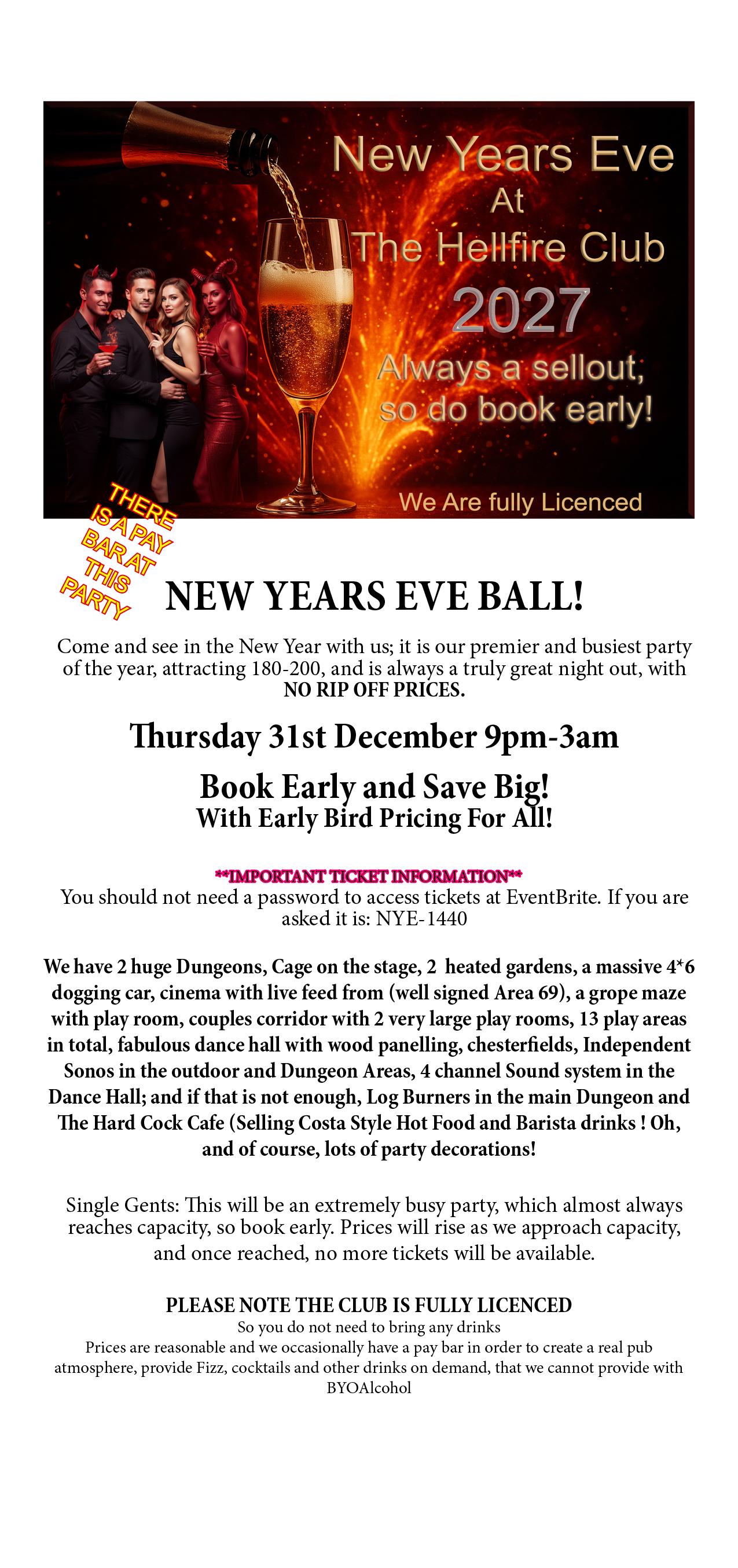 NYE this year is Tuesday 31st Dec, Discounted tickets until 20th Dec, or earlier, if we approach capacity!